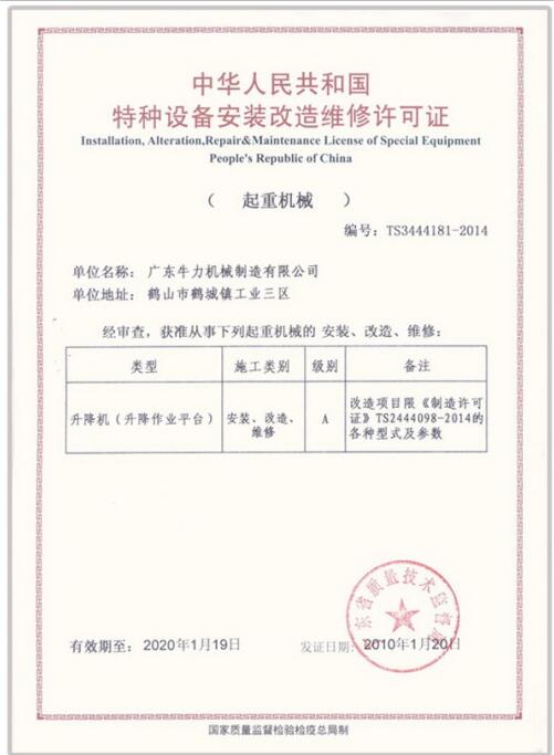 • 升降機特種設備生產許可